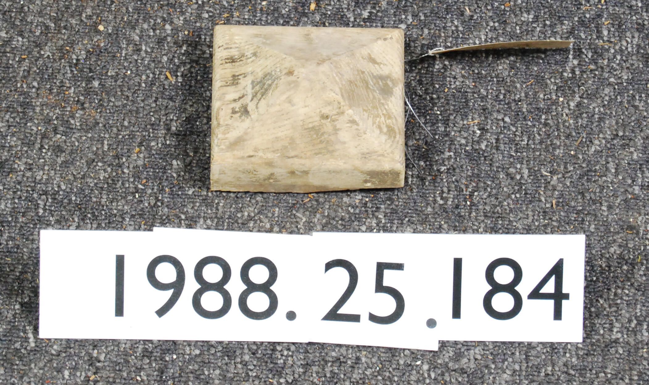 Newel post cap. Square block, quasi-pyramidal shaped top. Made of ash wood. Remnants of varnish.