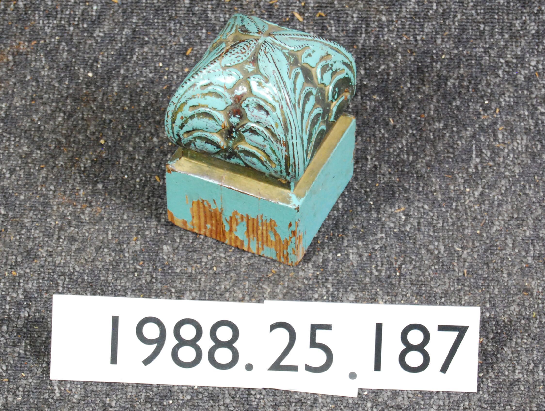 Newel post cap, cut from square post. Curved on sides to form pointed top. Has carved botanical motif. Bottom end truncated. Made of softwood - probably Douglas Fir. Originally varnished, now painted aqua with brass colored highlights.