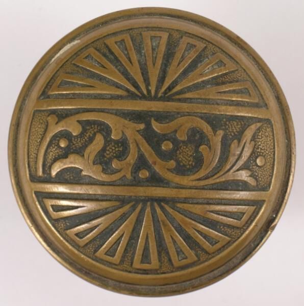 Construction: Stamped brass Surface Texture: Surface Color/Finish: Brass Ornament: Design Name: School: Remarks: VDA Classification: Group & No: F 123 Comment: Catalog : Company Name: Branford Date: 1893 Material: Brass Manufacturing Method: Stamped