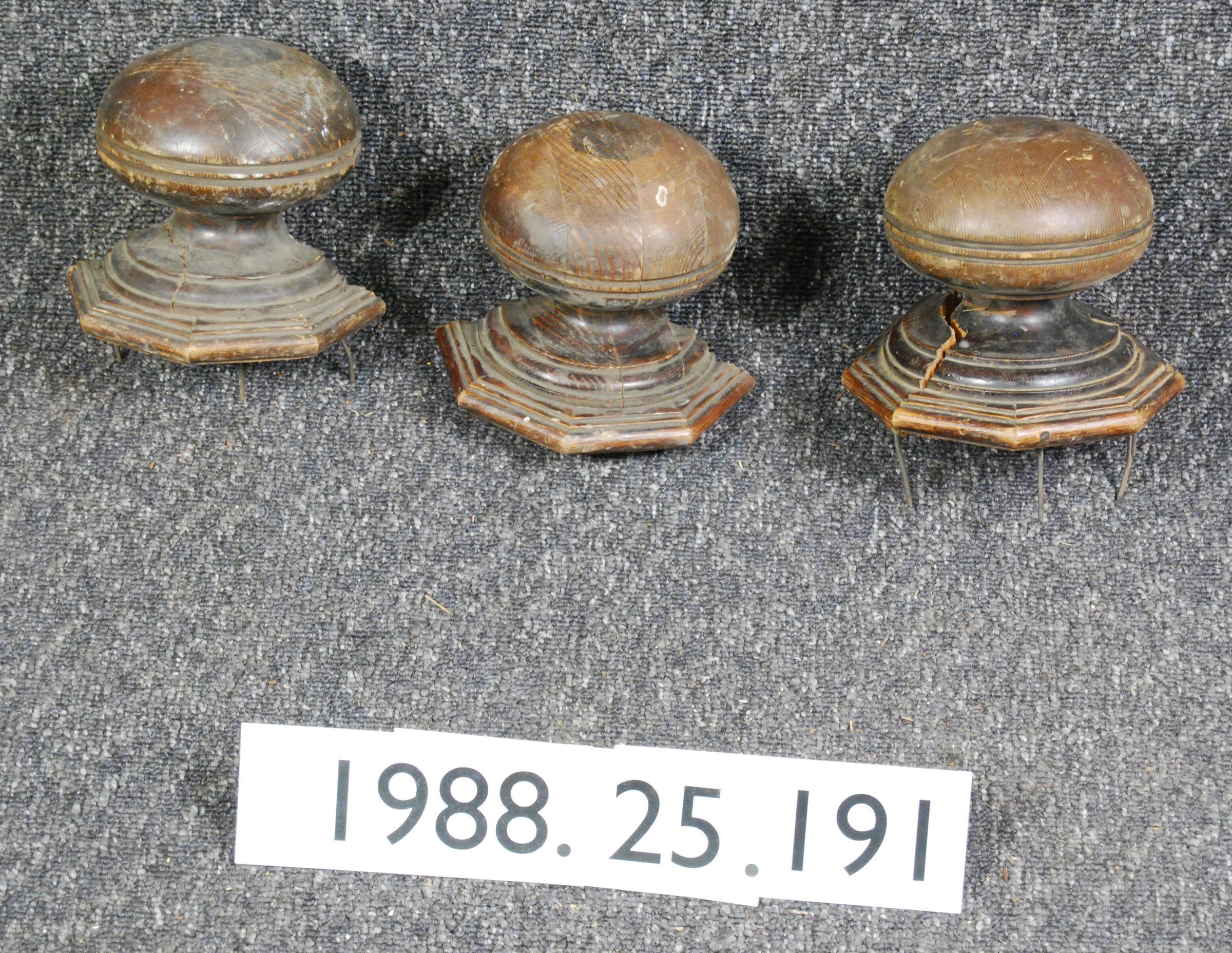 One lot of three newel post caps, each with incomplete multi-sided base, bulbous turned finial. Made of softwood. Varnished.