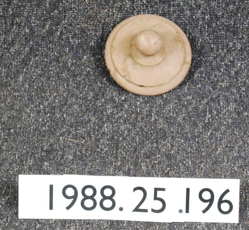 Turned finial, possibly from newel post. Ball top, circular base. Made of ash wood. Originally varnished - now painted beige.
