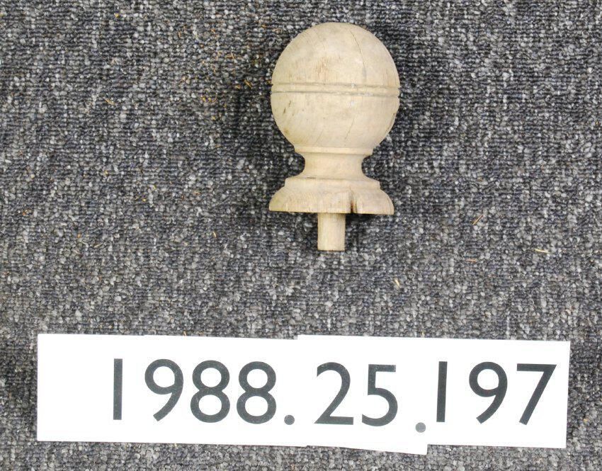 Turned finial, possibly from newel post. Ball shaped, with circular base. Tenon for mounting. Made of ash wood. Weathered surface. Type: Inscriptions or Markings: Manufacturer: Place of Manufacture: . Design motif: Style: Finish: None