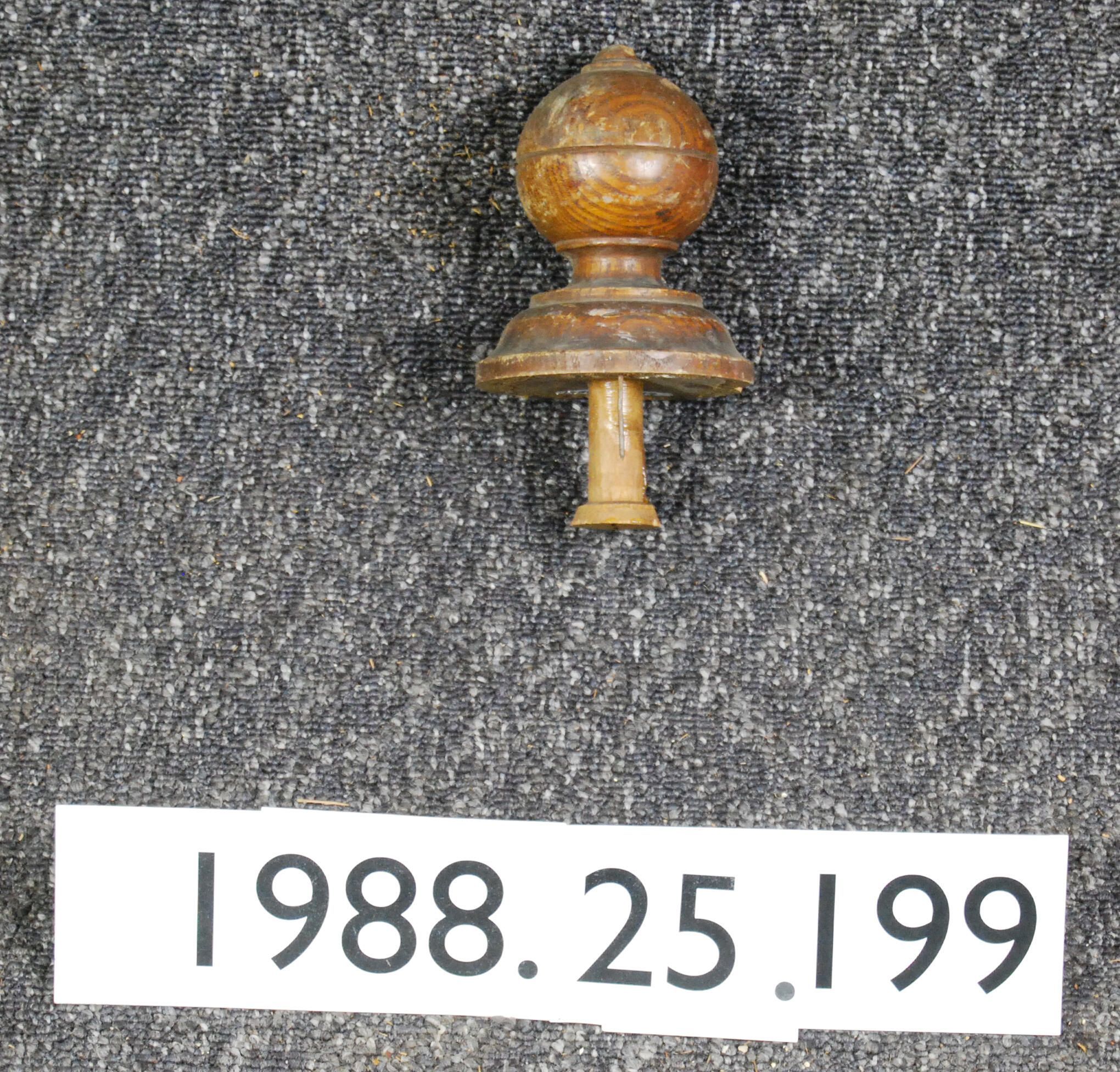Turned finial, possibly from newel post. Ball top, circular base, tenon at bottom. Made of ash wood. Varnished. Type: Inscriptions or Markings: Manufacturer: Place of Manufacture: . Design motif: Style: Finish: Varnished