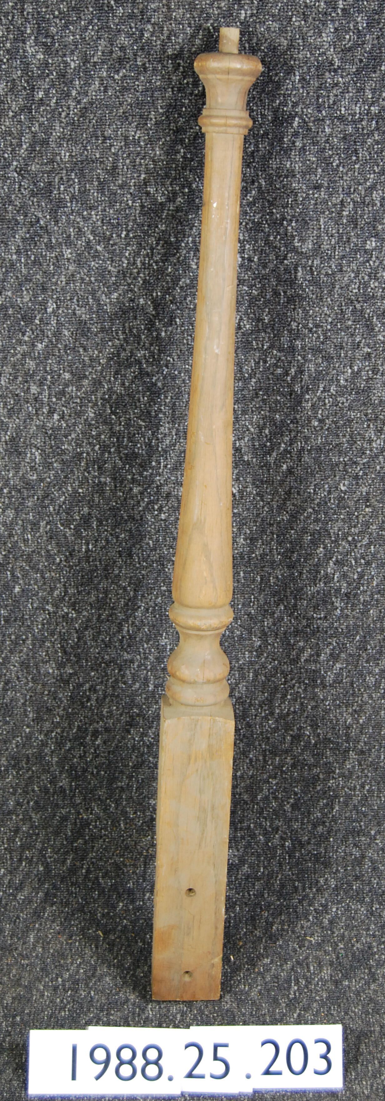 Turned post. (Possibly newel post???) Top has tenon. Base is square. Bottom notched. Made of hardwood. Unfinished. Type: Inscriptions or Markings: Manufacturer: Place of Manufacture: . Design motif: Style: Finish: None