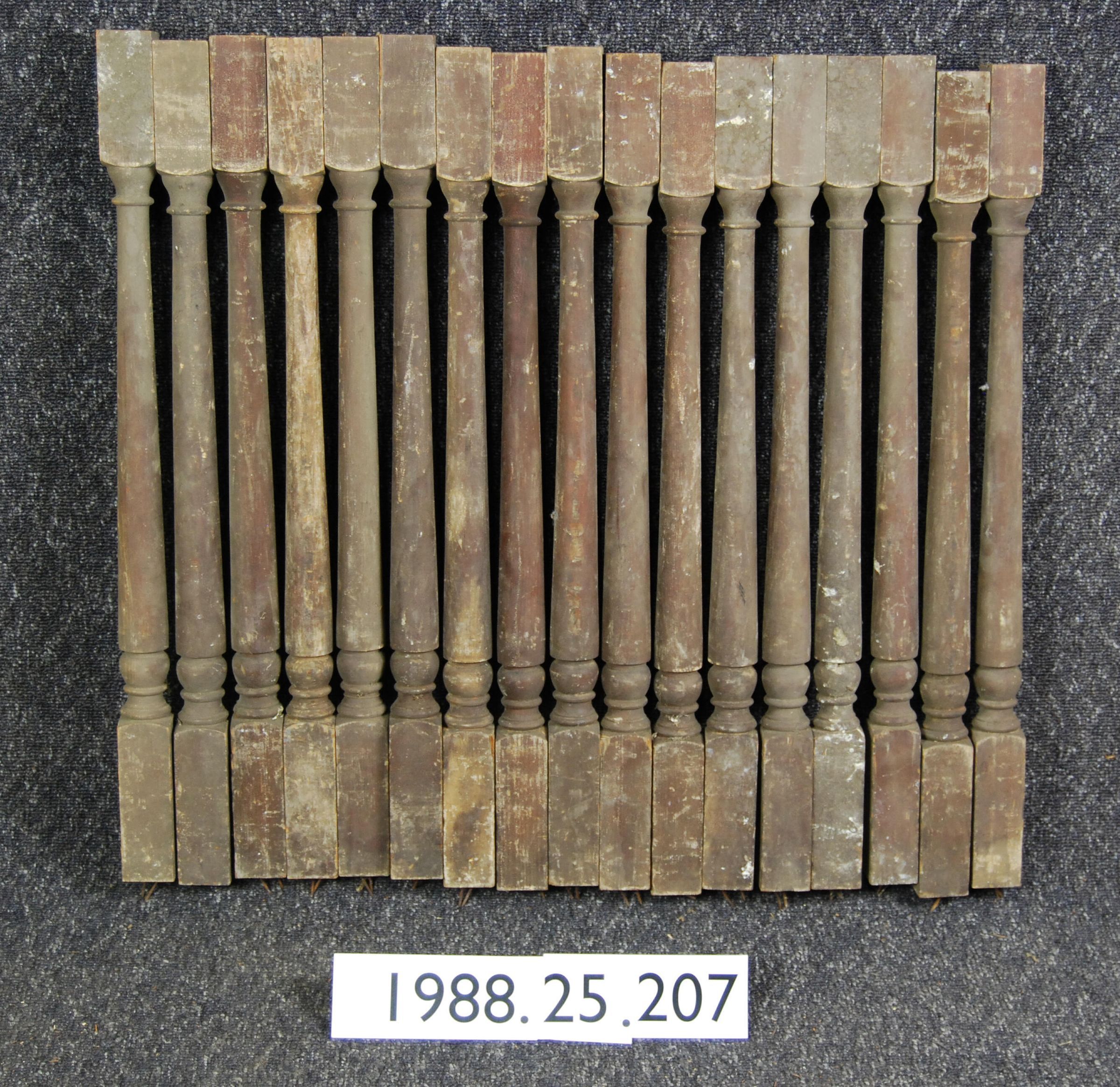 One lot of Seventeen turned stair balusters made of softwood. Varnished. Type: Inscriptions or Markings: Manufacturer: Place of Manufacture: . Design motif: Style: Finish: Varnished