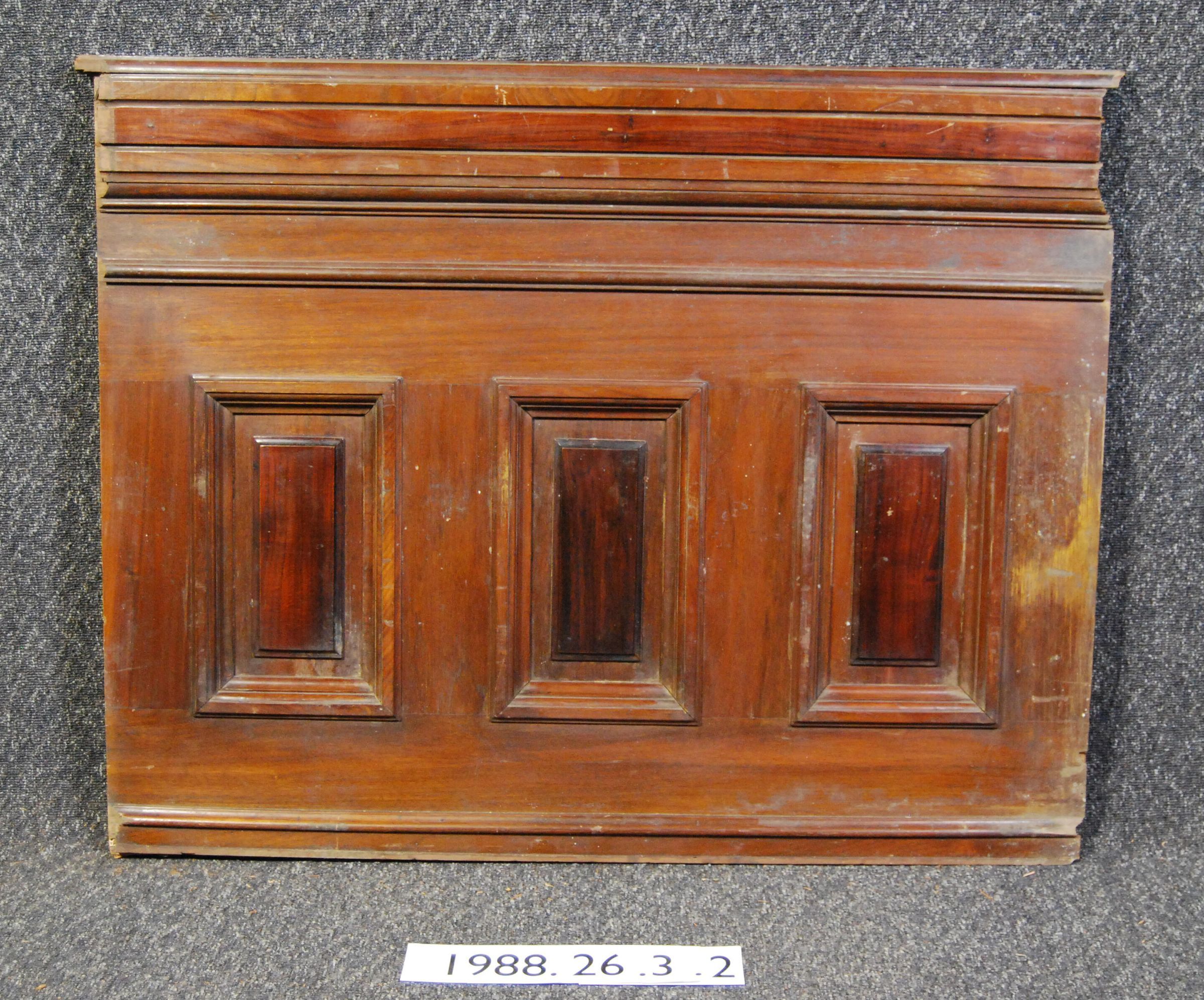 Interior wood paneling with chair rail molding. Applied complex contour moldings. Series of three recessed rectangular panels with raised centers. Entire face of paneling is veneered with two varieties of hardwood. Secondary wood is cedar. Varnished.