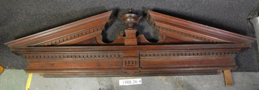 Interior wood. Classical Revival Style broken pediment with central urn-shaped finial., below which is lintel with central ornament, flanked on each side by dentils (matches pediment). Has simple freize. Applied compound contour moldings throughout pediment serves as surround at doorway in front hall - composed of multiple parts that fit together. Two types of hardwood. Secondary wood is cedar. Varnished finish.