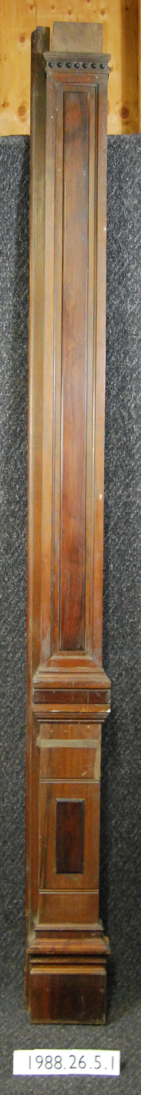 Interior wood. Classical Revival Style pilaster. Minor moldings missing. Face of pilaster has panel, applied moldings, applied panel. Originally served as door casing in conjunction with pediment in front hall. Plinth base made of two different hardwoods. Secondary wood is cedar. Varnished finish.