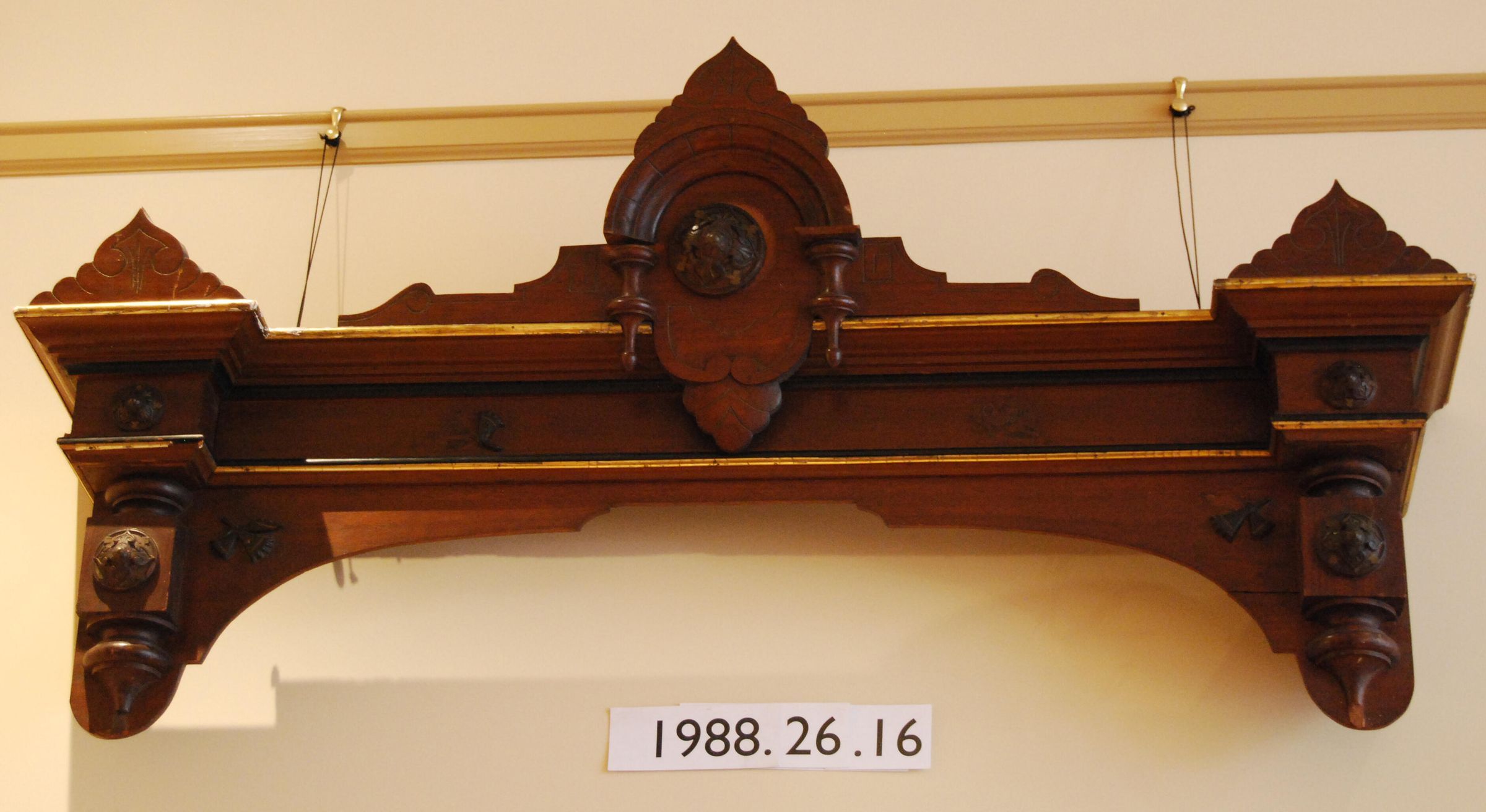 Interior wood. Elaborate window valance. Central arch-shaped pediment with rosette and half-turned drops, flanked on each side with angular fret cut pediments with incised scroll ornaments, below which are compound contour moldings with gilt trim and frieze panel. Has series of applied ornaments, below which are half-turned drops mounted on symmetrically carved backing board. Made of hardwood. Varnished.