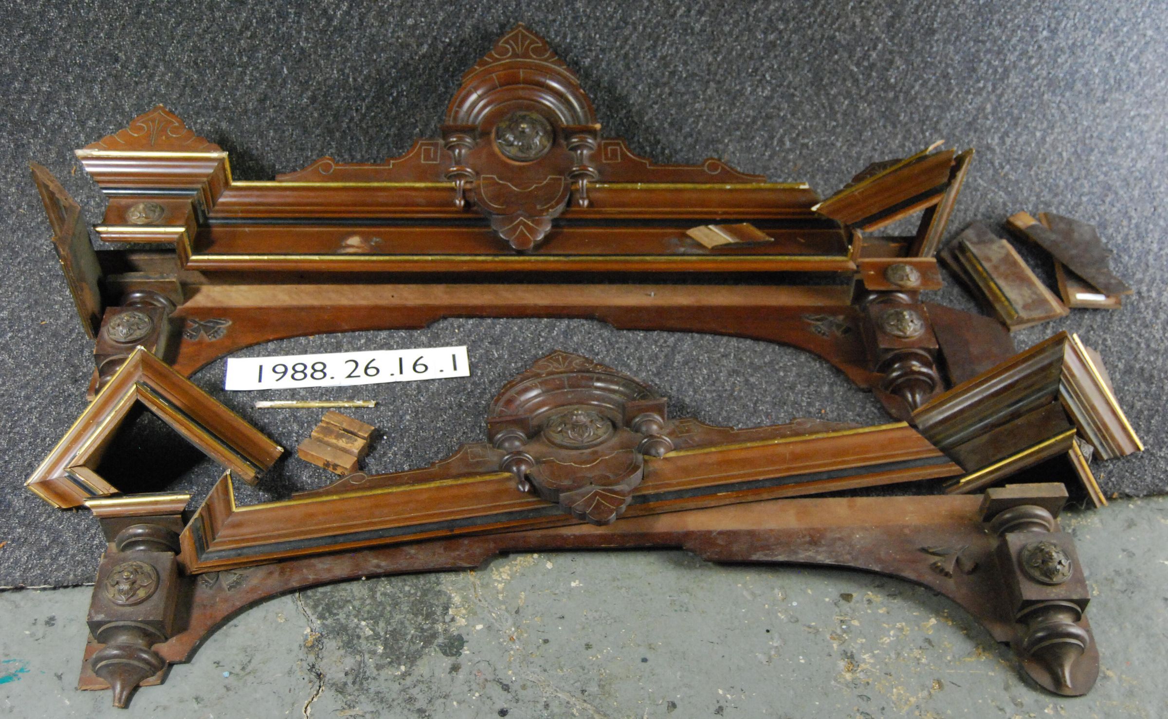 One lot of two interior wood, elaborate window valances. Now disassembled but includes two nearly complete components matching 1988.26.16. Some missing parts and may include extra parts. Central arch-shaped pediment with rosette and half-turned drops, flanked on each side with angular fret cut pediments with incised scroll ornaments, below which are compound contour moldings with gilt trim and frieze panel. Has series of applied ornaments, below which are half-turned drops mounted on symmetrically carved backing board. Made of hardwood, Varnished.