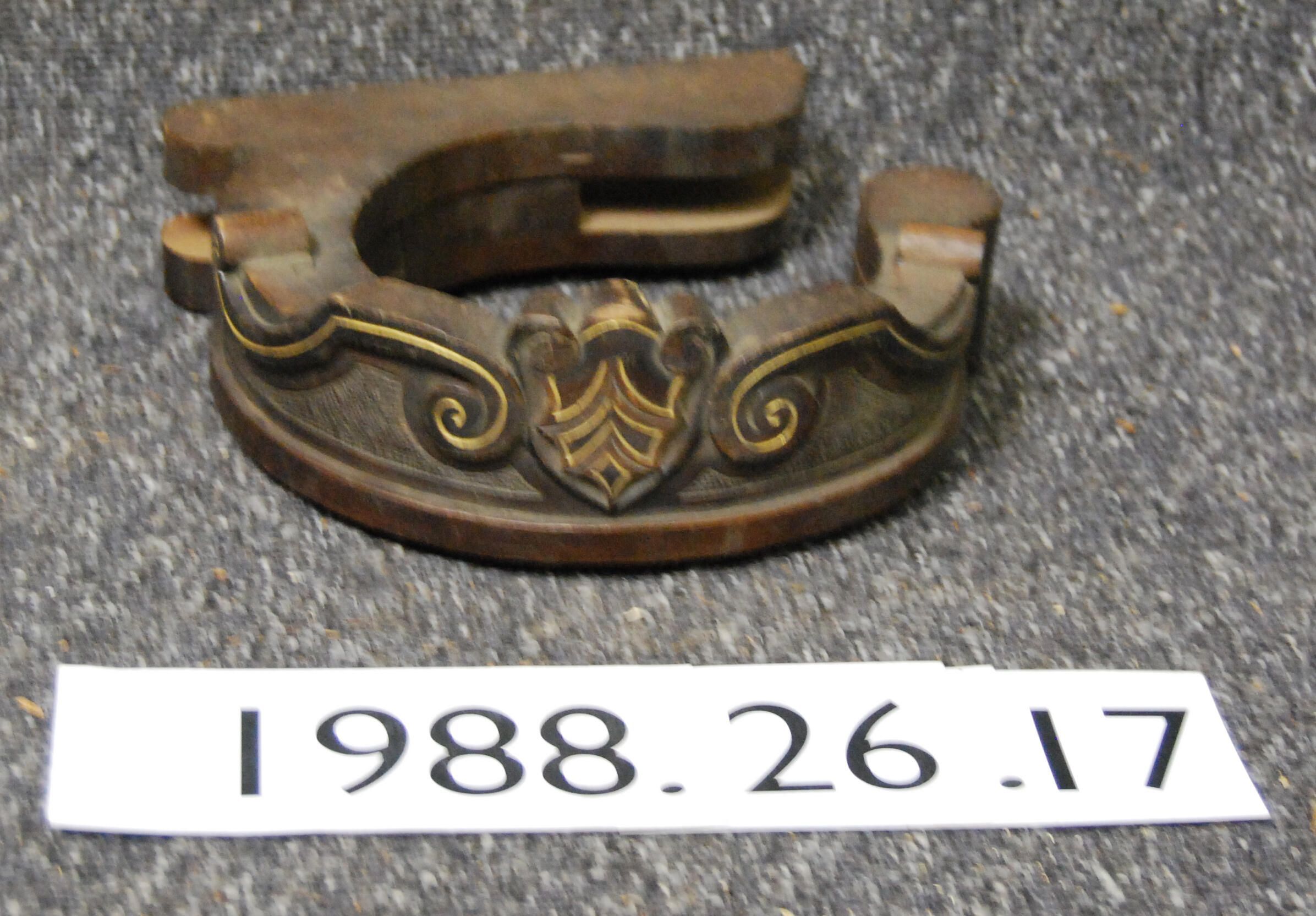 Interior wood "C"-shaped curtain tie-back. Carved relief scroll and shield motif, gilt trim. Small piece missing. Varnished / gilt finish.