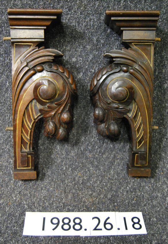 One pair of matching interior wood ornaments, each with carved botanical motif swags. Incised gilt trim. Moldings at top. Made of hardwood, varnished.