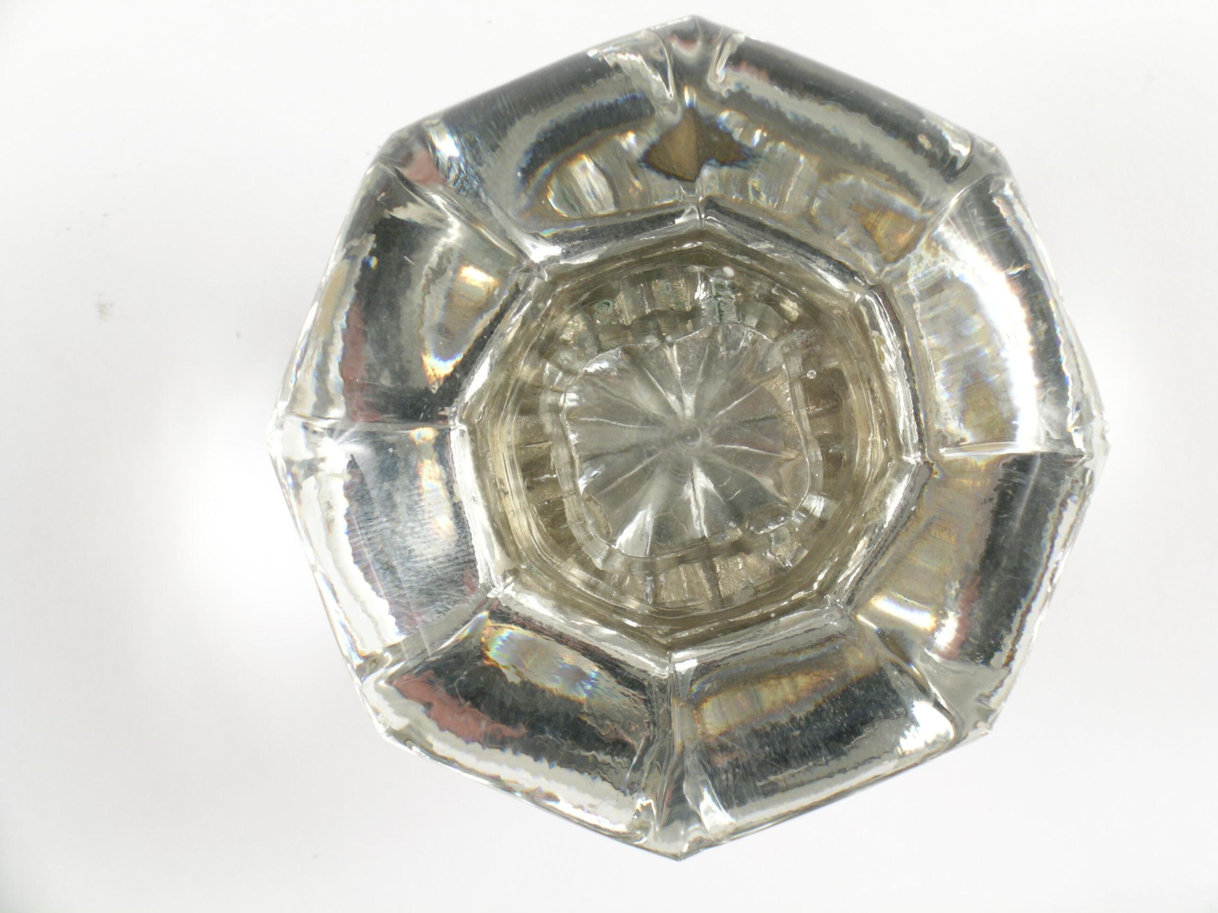 Construction: 2 part glass / brass Surface Texture: Dead smooth Surface Color/Finish: Natural Ornament: Plain Design Name: School: Remarks: Lock type: octagonal faceted clear glass VDA Classification: Group & No: Comment: Catalog : Company Name: Date: Material: Glass/ Brass Manufacturing Method: Cast Glass