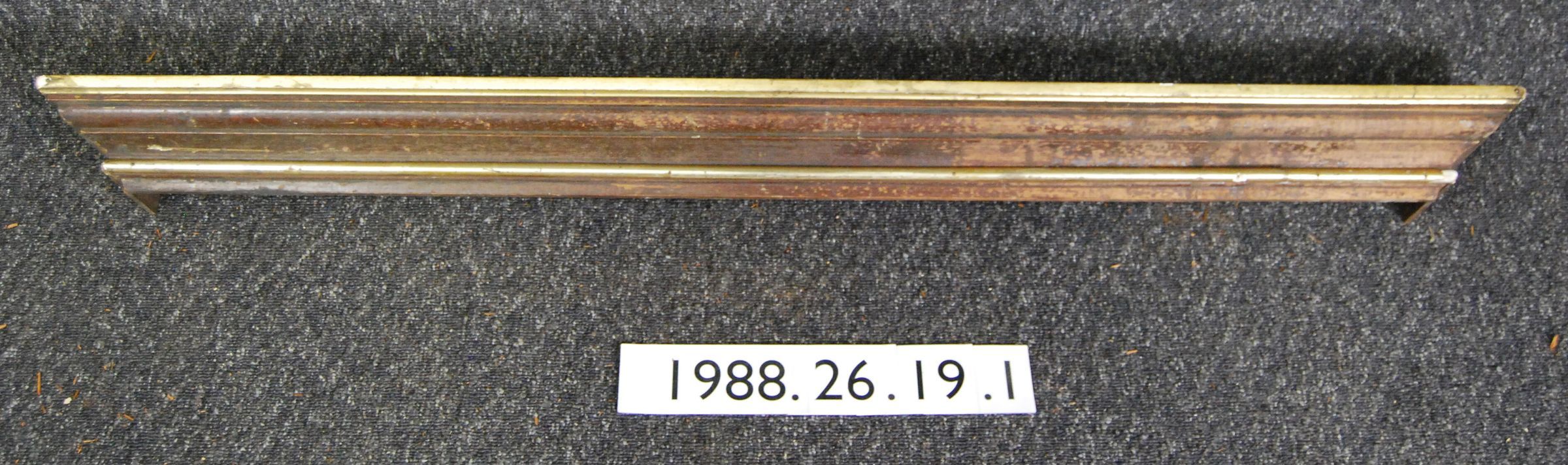 Interior wood window valance. Compound molding profile with gilt trim. Has mitred return on both ends. Has iron screw hooks on back for mounting. Made of hardwood. Finish: Varnished.