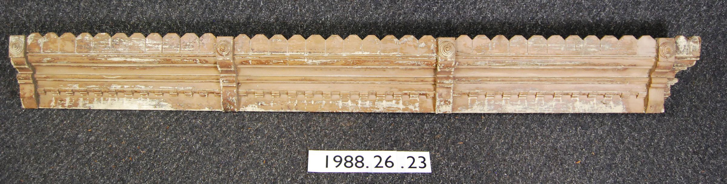 Interior wood valance (possibly window valance). Eastlake style with repeating equi-distant geometric ornamentation. Dentils and bulls eye decoration. Return at right end. Other end has iron screw eye at back for mounting. Made of softwood. Originally painted, now partially stripped.