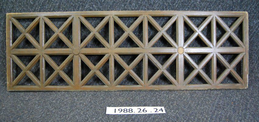 Interior wood window grille. Rectangular frame, with series of equi-distant cross-sticking forming triangular openings. Molded interior edges. Applied plain medallions (two are missing). Bottom edge bevelled. White oak, varnished. Type: Inscriptions or Markings: Manufacturer: Place of Manufacture: Design motif: Style: Finish: Varnished