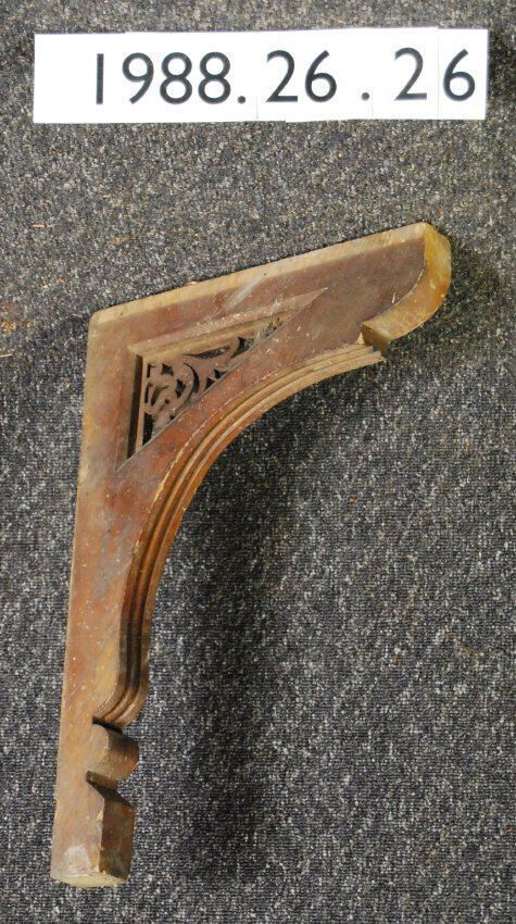 Interior wood bracket. Sides have fret-sawn botanical motif insert. Front edge is partially reeded. Made of ash wood. Varnished.