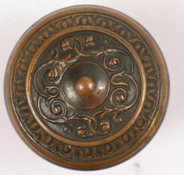 Construction: 2 part Surface Texture: Surface Color/Finish: Bronze Ornament: Stamped Design Name: Mantua School: Colonial Remarks: VDA Classification: Group & No: F 230 Comment: Catalog : Company Name: Corbin Date: 1905 Title: P 8 F Corbin - pg 525 no. 71522 Material: Wrought brass Manufacturing Method: