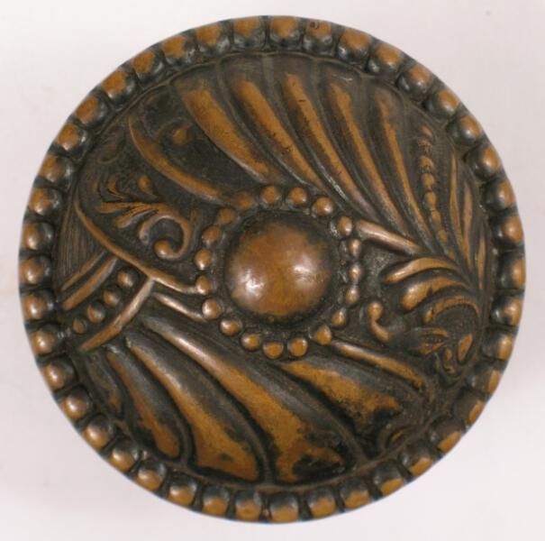 Construction: 3 part wrought Surface Texture: Surface Color/Finish: Olive - bronze Ornament: Stamped Design Name: Roanoke School: Unclassified Remarks: See pg. 73 Antique Builders Hardware VDA Classification: Group & No: B 215 Comment: Catalog : Company Name: Corbin Date: c. 1895 Material: Metal - Bronze Manufacturing Method: Wrought
