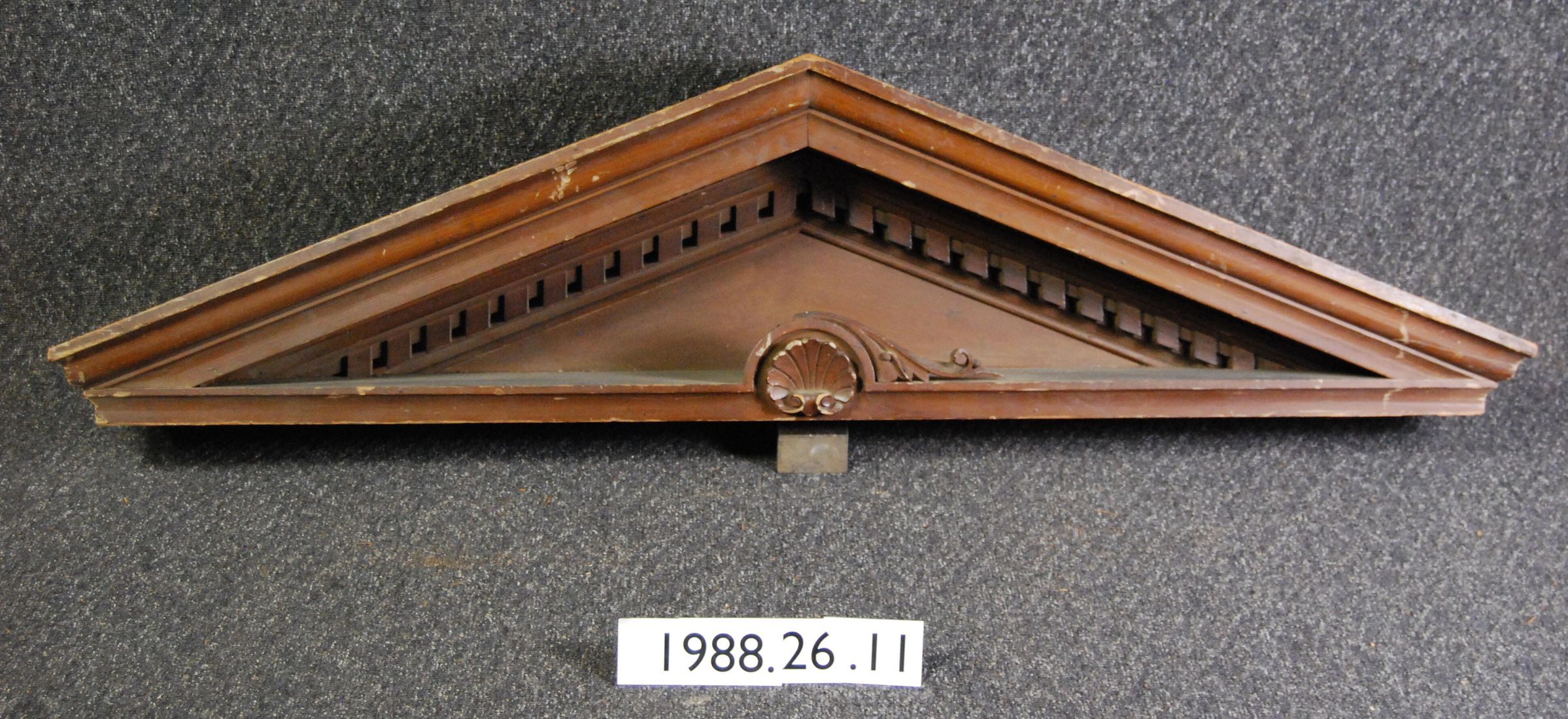 Interior wood classical revival style pediment with complex molding configuration. Recessed opening with dentils, central scallop motif with symmetrical scrolls around. One detached scoll ornament. Carved ornaments in botanical style. Made of cedar, varnished finish.