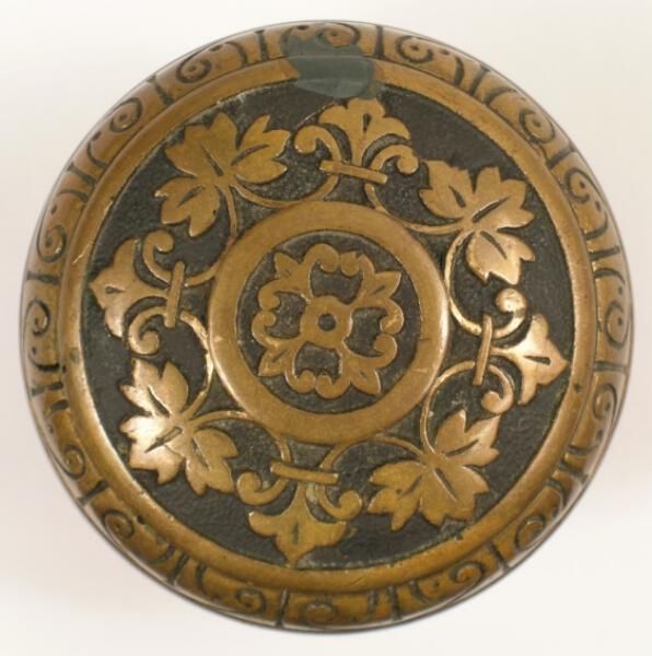 Construction: Cast Surface Texture: Surface Color/Finish: Dark bronze Ornament: Engraved and relief Design Name: School: Classic Remarks: Heavy engraved design on under knob. VDA Classification: Group & No: H 111 Comment: Catalog : Company Name: Corbin Date: 1895 in TAD p. 174 no. 2579 pg 555 Material: Cast Bronze Manufacturing Method: Center, beaded