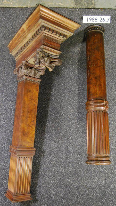 Interior wood. Classical revival style colonnade, composed of two columns. One column is cylindrical with detached incomplete capital. Column has beaded ornament, veneered shank, banded collar, reeded lower section. Other column has two sides joined at right angles with matching decorative components. Includes capital with botanical motif, and abacus parts. Above the columns there is a hollow component composed of complex contoured moldings. Frieze panels. Dentils, and crown moldings. Made of two different hard woods. Secondary wood is cedar. Varnished.