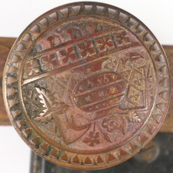 Construction: 2 part ? Surface Texture: Surface Color/Finish: Bronze Ornament: Cast Design Name: Broken Leaf School: Vernacular Remarks: Ornament covers all but shank VDA Classification: Group & No: B 126 Comment: Catalog : Company Name: Lockwood Date: c. 1887 Material: Metal Manufacturing Method: Cast Bronze