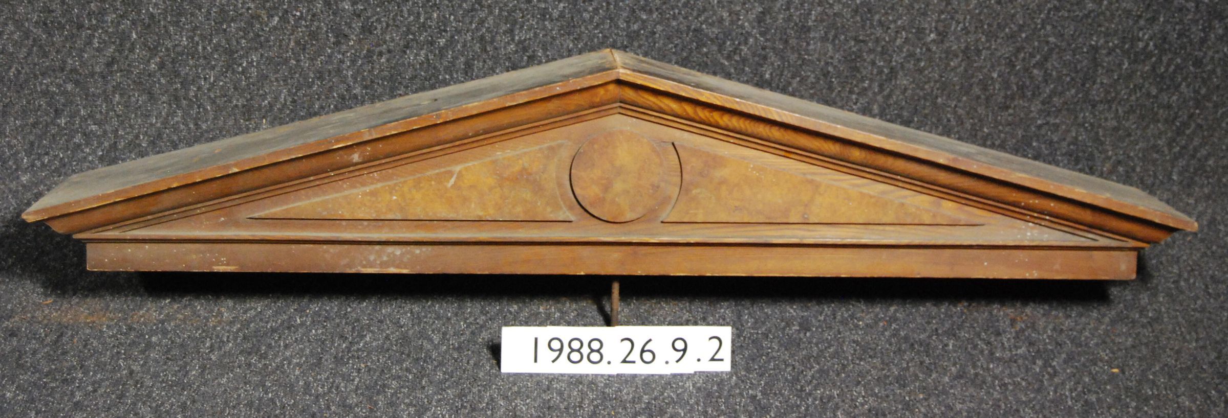 Interior wood, Classical Revival Style pediment. Compound moldings and burled veneer panels. Made of ash, secondary wood is cedar. Varnished finish.