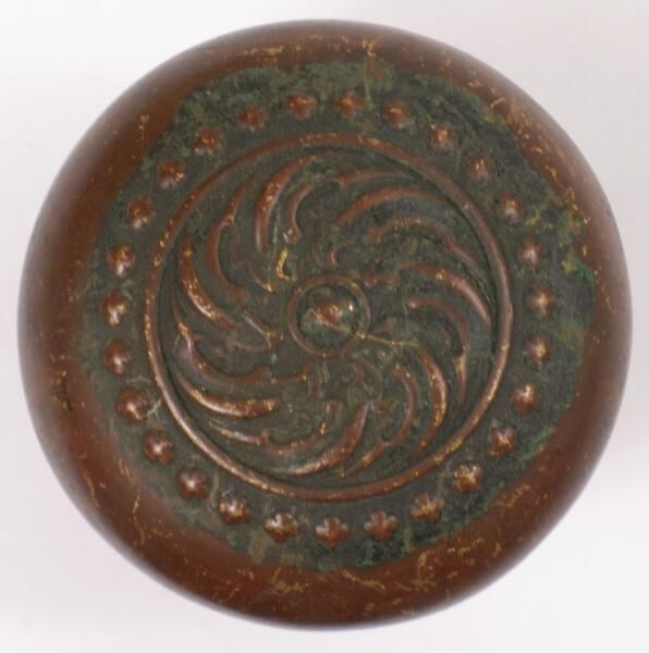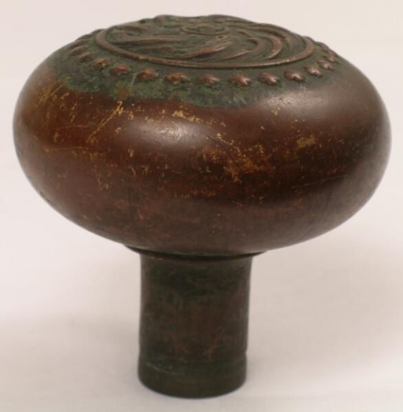 Construction: 2 part- spun over wrought Surface Texture: Smooth Surface Color/Finish: Bronze Ornament: Stamped Design Name: School: Remarks: Cast shank - wrought top VDA Classification: Group & No: Comment: Catalog : Company Name: Date: c. 1895 Material: Metal bronze Manufacturing Method: