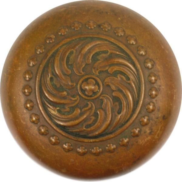 Construction: 2 part - spun over wrought Surface Texture: Smooth Surface Color/Finish: Bronze Ornament: Stamped Design Name: School: Remarks: Cast shank - wrought top VDA Classification: Group & No: Comment: Catalog : Company Name: Date: c. 1895 Material: Metal bronze Manufacturing Method: