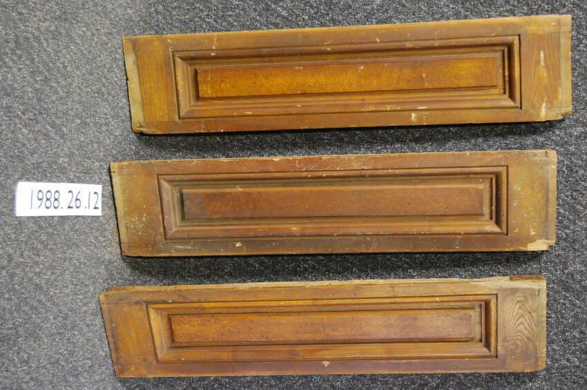One lot of three interior wood panels. Possibly used as coffer inside window or door frame in horizontal orientation. Recessed panel with raised center. Burl veneer. Made of ash wood, varnished finish.