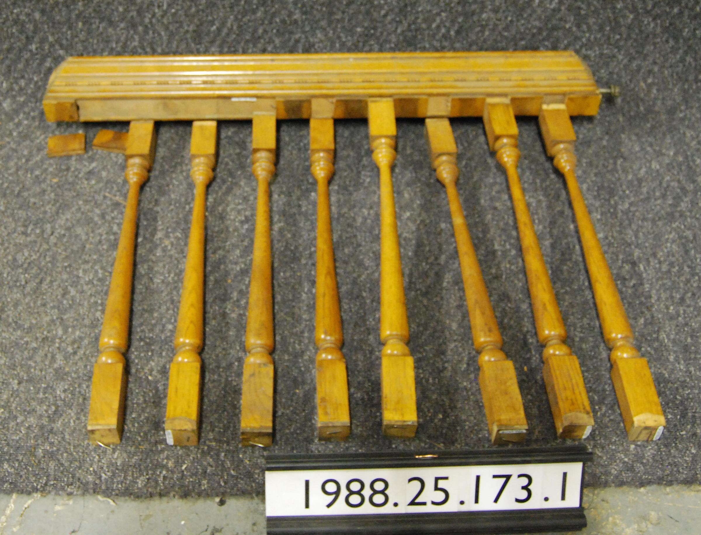 Balustrade composed of built-up handrail with complex moldings. Set of eight turned balusters, and associated detached parts. See 1877.25.173. See also 1988.25.172 and 1988.25.55. Made of oak. Handrail has secondary soft wood.