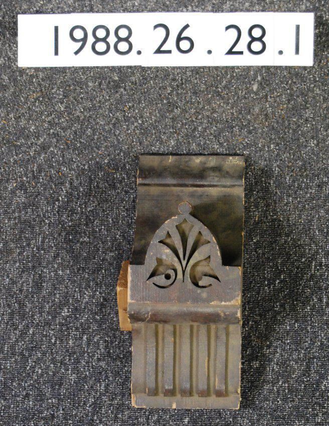 Interior wood, compound contour. Applied ornament on front including fret-sawn arch shaped pediment, and partial reeding. Made of cedar, varnished.