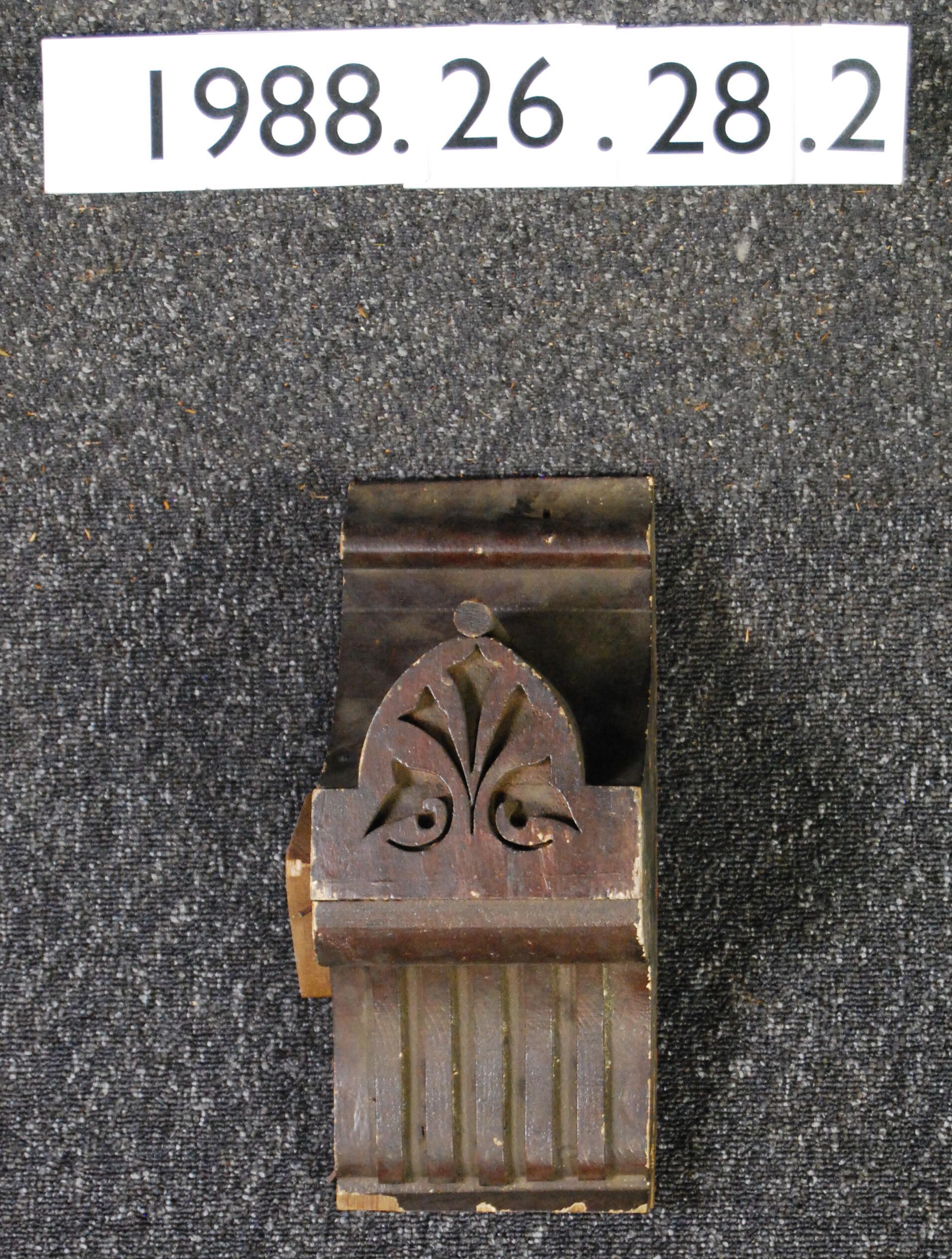 Interior wood, compound contour. Applied ornament on front including fret-sawn arch shaped pediment, and partial reeding. Made of cedar, varnished.