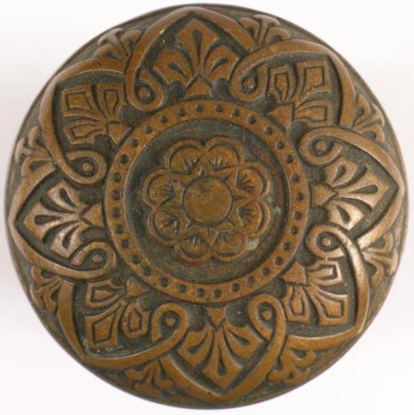 Construction: 2 part Surface Texture: Surface Color/Finish: Bronze - relieved Ornament: Cast Design Name: School: Classic Remarks: VDA Classification: Group & No: K 104 Comment: Catalog : Company Name: Russell & Erwin Date: 1899 p. 202 Material: Metal - Bronze Manufacturing Method: Cast