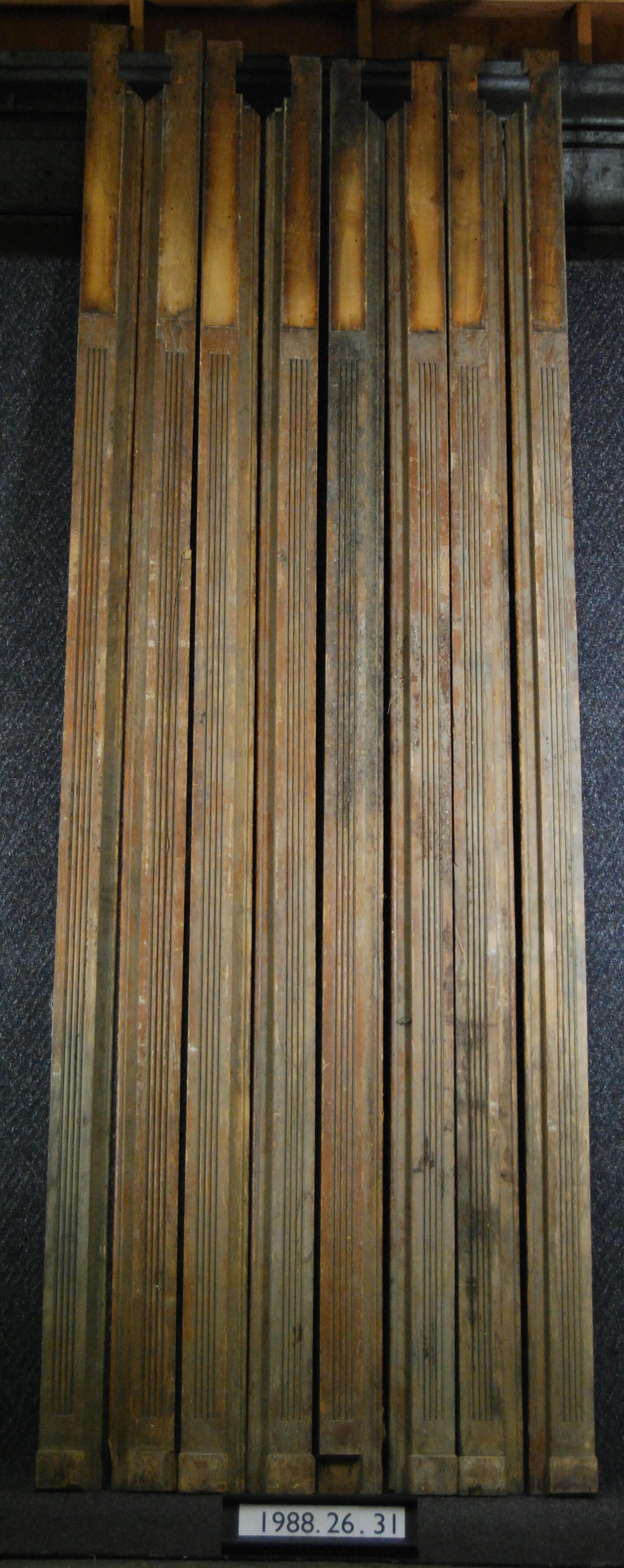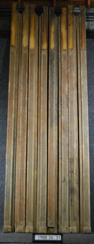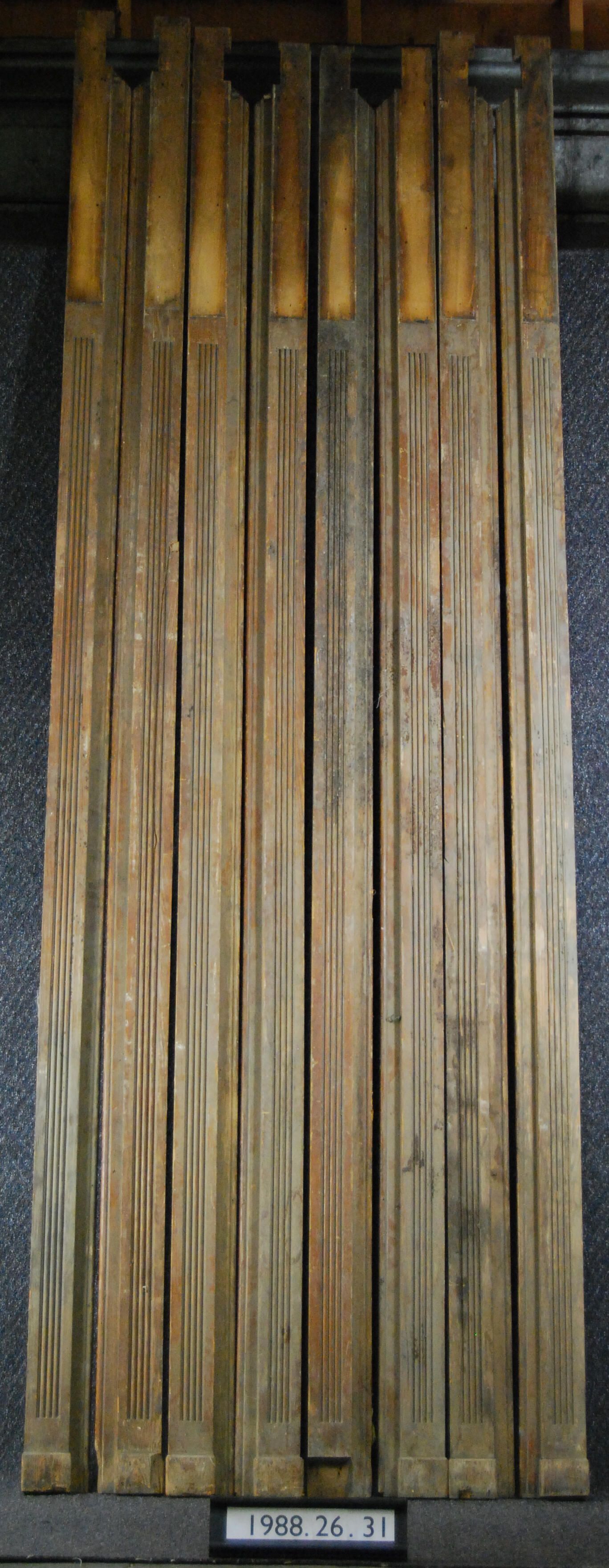 One lot of eight window casings (moldings). Each with reeded front face. Rebate at one edge. Brass curtain and hardware at upper end. Originally had trim mounted at top end. See 1988.26.31.6 and is associated with 1988.26.31.4 (horizontal casing). Made of ash. Varnished.