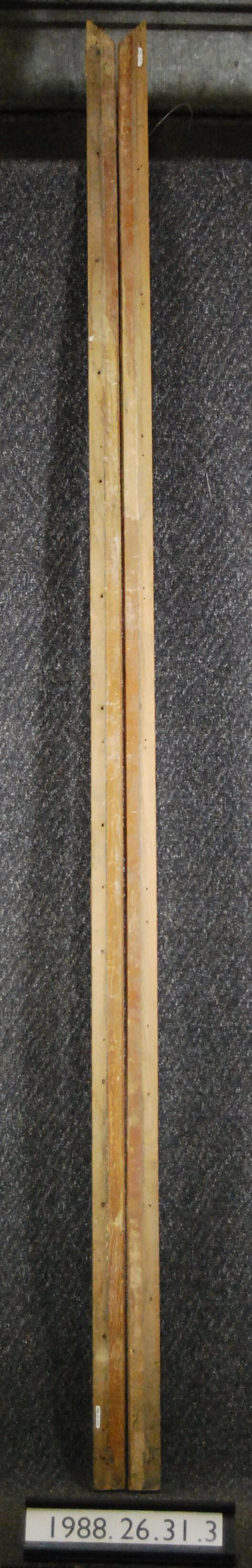 One lot of two trim strips. One edge is beveled. One end of each is mitred. Made of ash. Varnished.