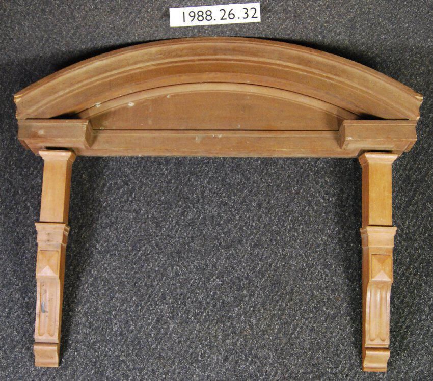 Classical revival style assembly composed of arched pediment below which are brackets on each respective side. Has applied moldings. Recessed panel. Brackets partially fluted. See 19988.26.33. Includes short section of detached molding associated with same pediment(s). Made of white oak. Varnished.