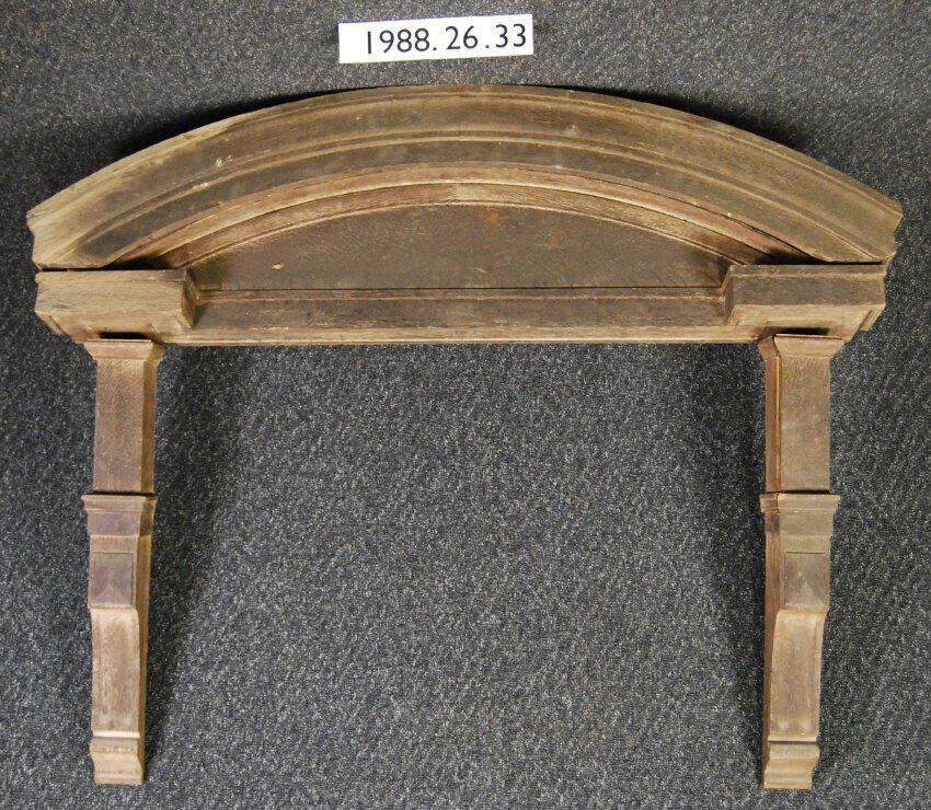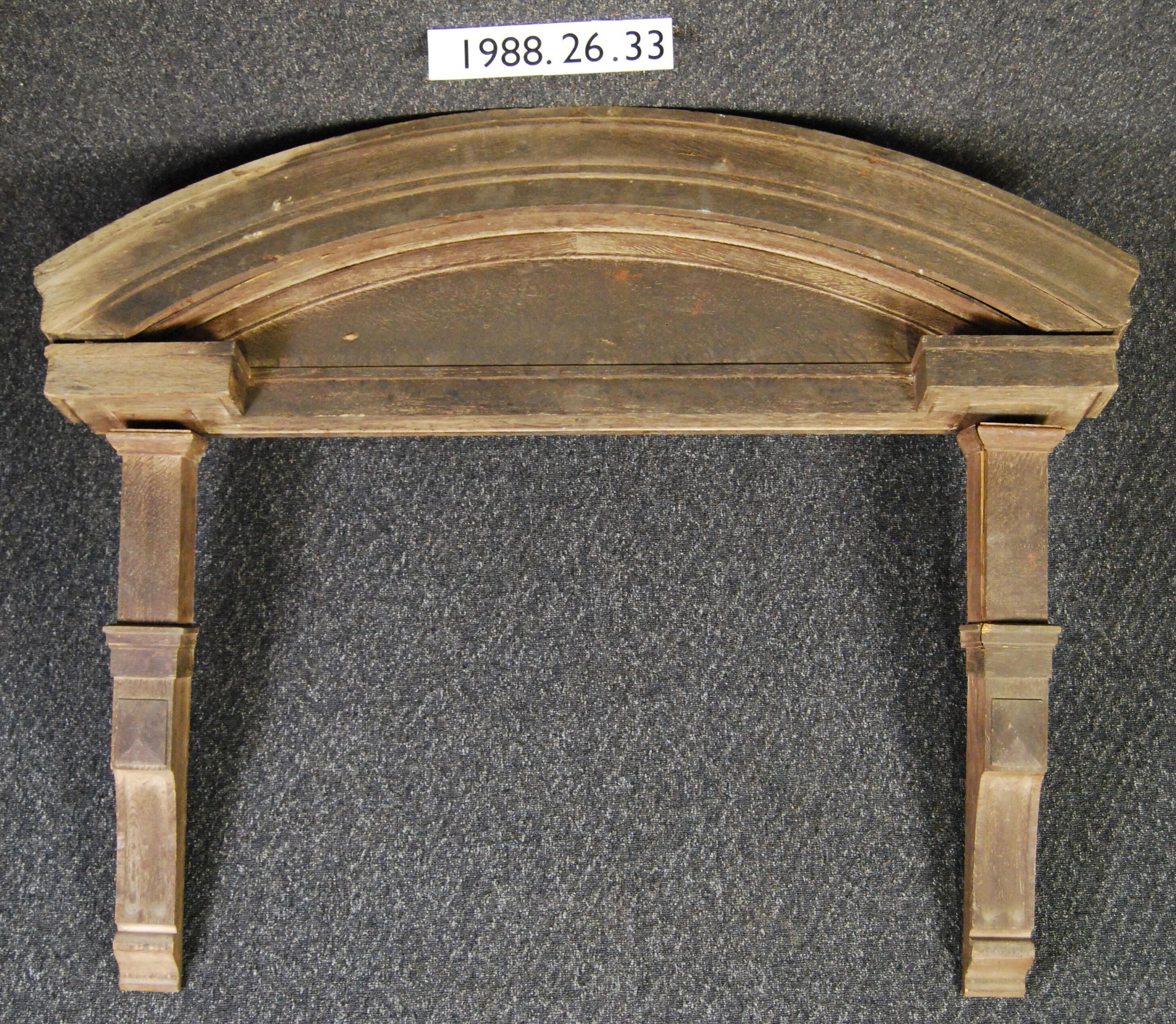 Classical revival style assembly composed of arched pediment below which are brackets on each respective side. Has applied moldings. Recessed panel. Brackets partially fluted. See 19988.26.32. Includes short section of detached molding associated with same pediment(s). Has detached parts. Made of white oak. Varnished.