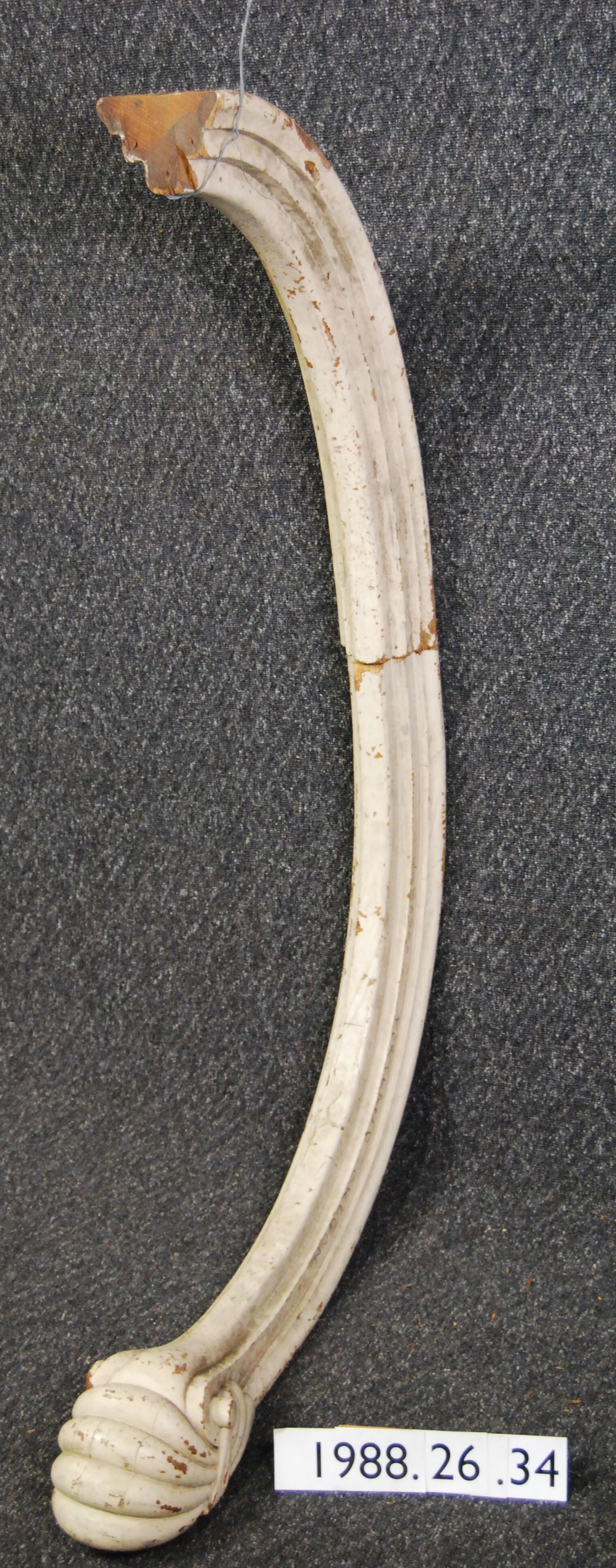 Unidentified ornament. Composed of three curved parts which together form "C" shaped configuration. One end of one section has stylized bulbous organic motif made of built-up laminated oak. Originally varnished - now painted white.