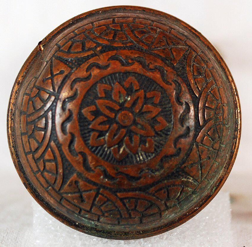 Construction: Surface Texture: Surface Color/Finish: Relieved Ornament: Fourfold symmetry Design Name: Windsor type School: Eastlake Remarks: Not really related to other Windsor designs. VDA Classification: Group & No: H 254 -254A Comment: Combination of the two designs Catalog : Company Name: Reading Type Date: c. 1890 Material: Brass Manufacturing Method: Stamped