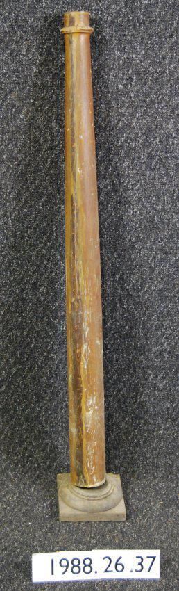 Interior wood classical revival --Tuscan-style column. Capital is missing. Column has necking and astragal molding near top, below which is tapered column. Has turned base with square plinth block, varnished.