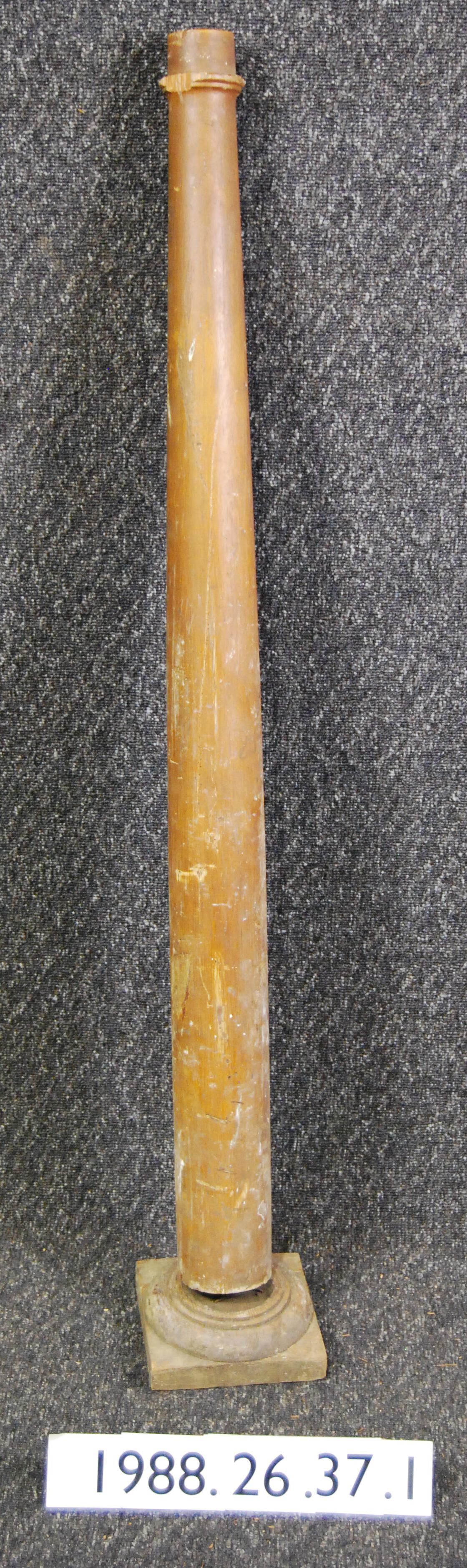 Interior wood classical revival --Tuscan column. Capital is missing. Column has necking and astragal molding near top, below which is tapered column. Has turned base with square plinth block, varnished.
