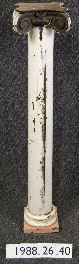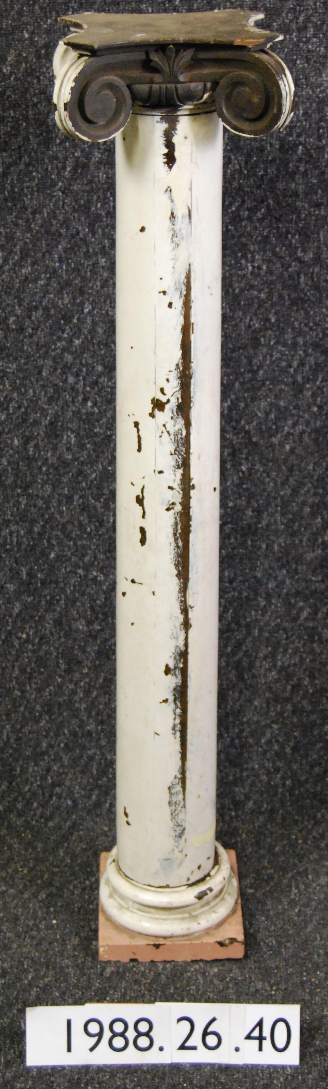 Interior wood classical revival style column in the Ionic Order. Capital has volutes. Egg-and-dart molding. Carved botanical motifs, below which is tapered column. Turned base with square plinth block. Wood is ash. Originally varnished -- now painted white and pink.