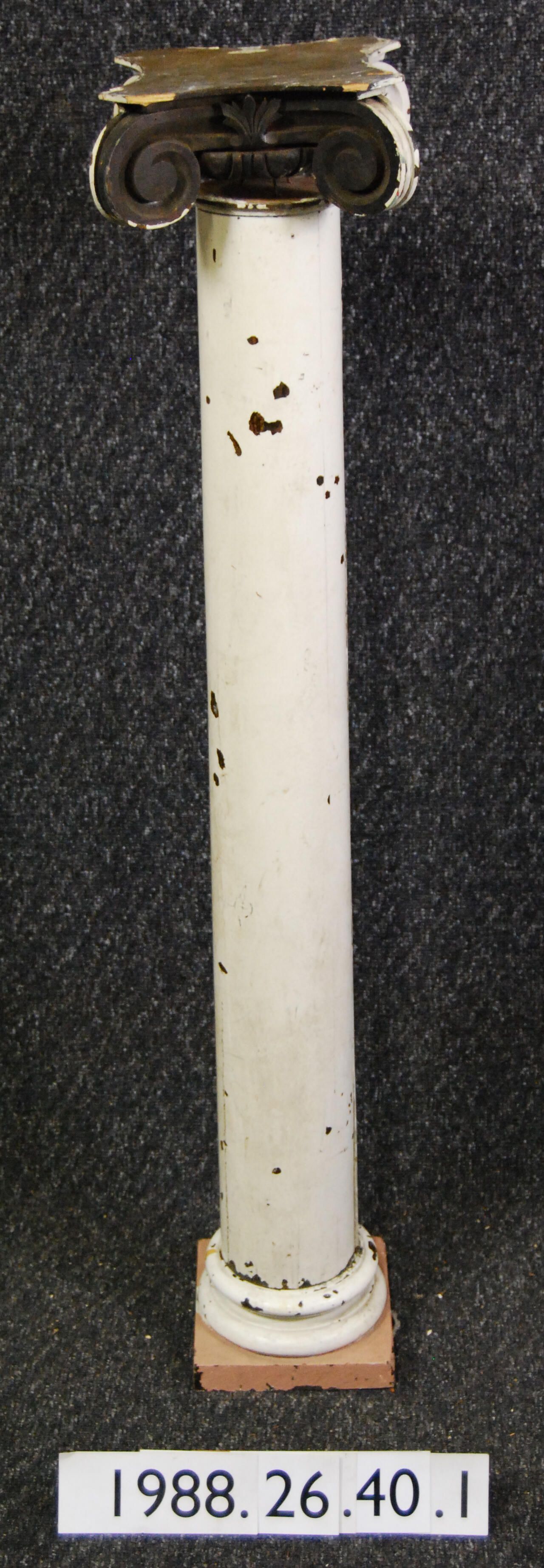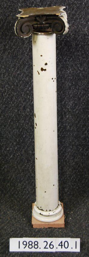 Interior wood classical revival style column in the Ionic Order. Capital has volutes. Egg-and-dart molding. Carved botanical motifs, below which is tapered column. Turned base with square plinth block. Capital and base are detached from column. Wood is ash. Originally varnished -- now painted white and pink.