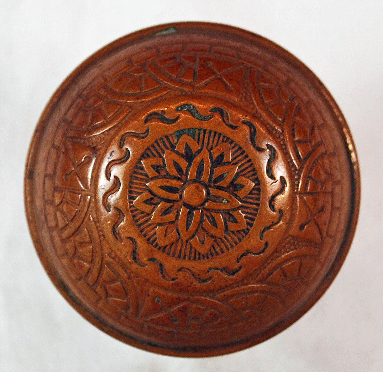 Construction: Surface Texture: Surface Color/Finish: Relieved Ornament: Fourfold symmetry Design Name: Windsor type School: Eastlake Remarks: Not really related to other Windsor designs. VDA Classification: Group & No: H 254 -254A Comment: Combination of the two designs Catalog : Company Name: Reading Type Date: c. 1890 Material: Brass Manufacturing Method: Stamped