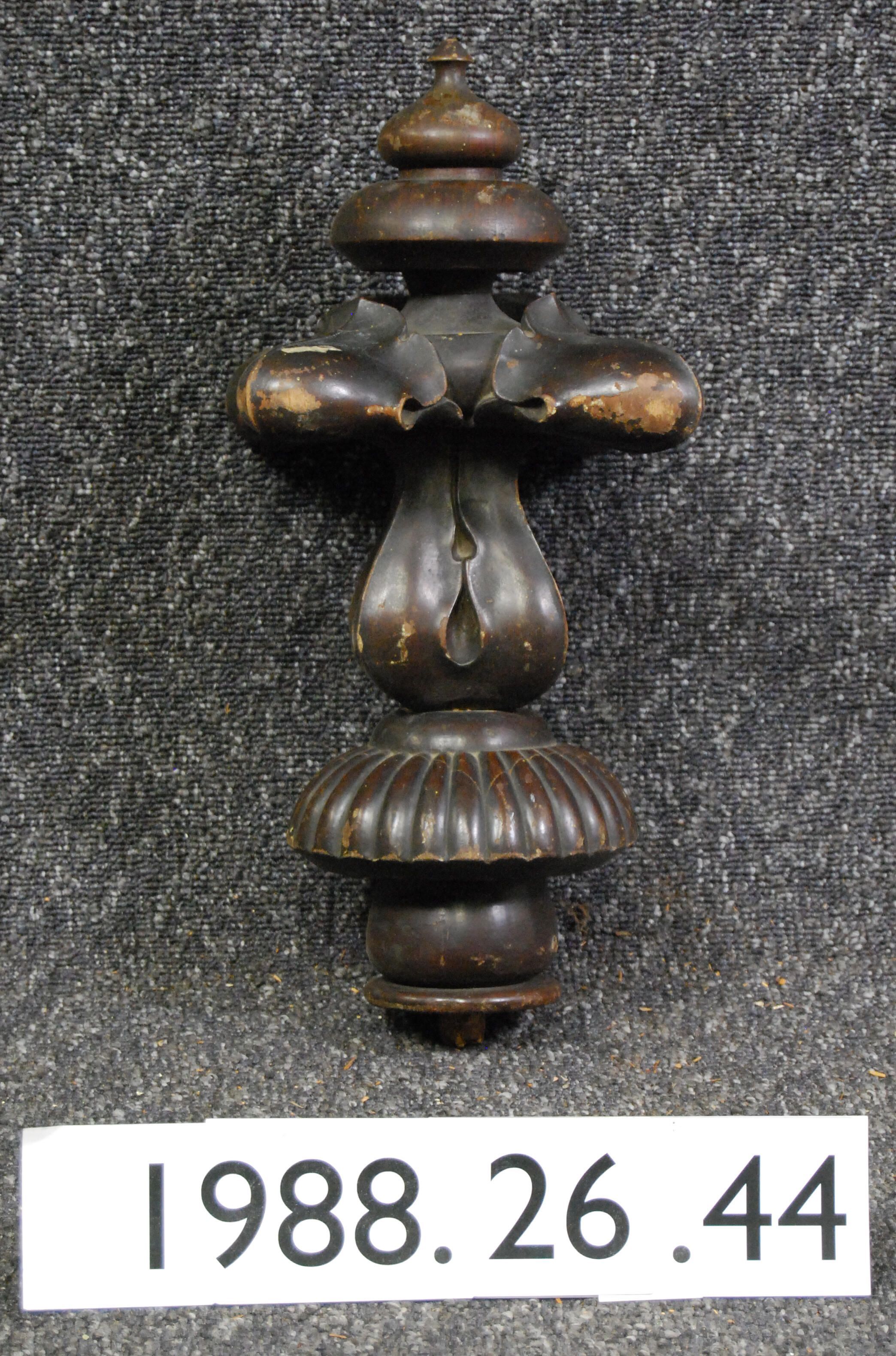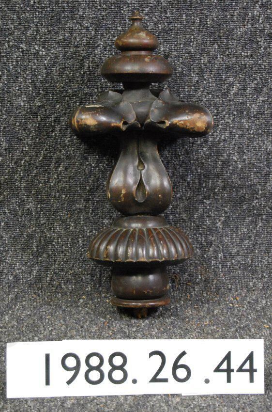 Interior wood finial. Has botanical motifs. Made of mahogany, varnished. Type: Inscriptions or Markings: Manufacturer: Place of Manufacture: Design motif: Botanical Style: Finish: Varnished