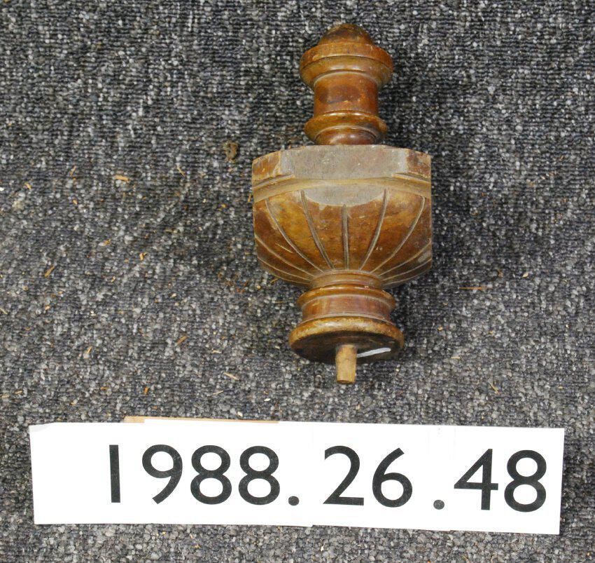 Interior wood finial. Turned with complex contours. Presumed to be of architectural origin. Hard- wood. Varnished. Type: Inscriptions or Markings: Manufacturer: Place of Manufacture: Design motif: Style: Finish: Varnished