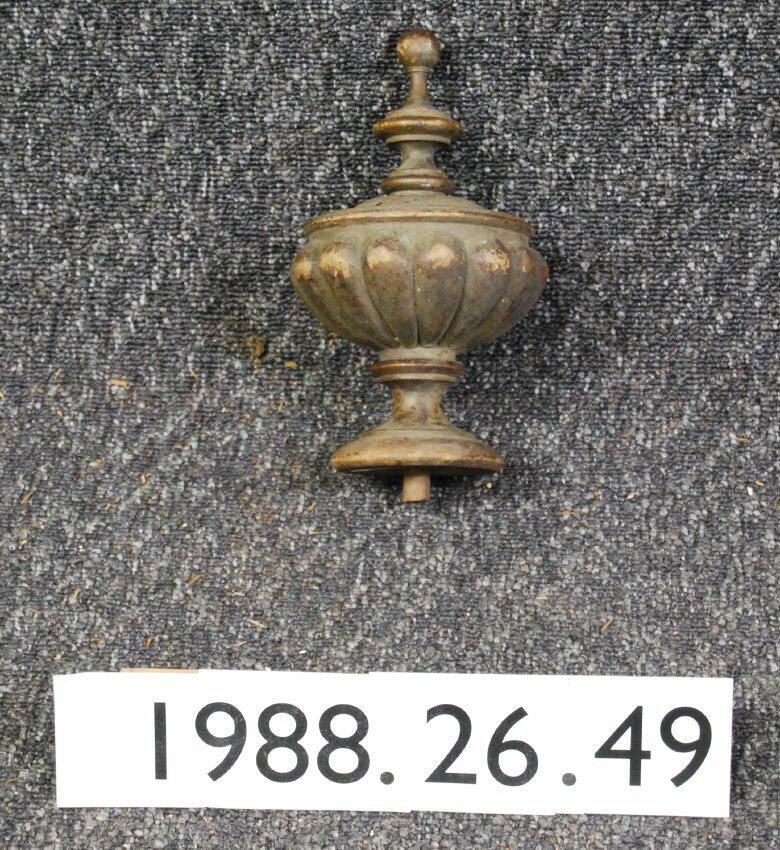 Interior wood finial. Turned with complex contours. Organic motif. Hardwood. Varnished. Type: Inscriptions or Markings: Manufacturer: Place of Manufacture: Design motif: Organic Style: Finish: Varnished