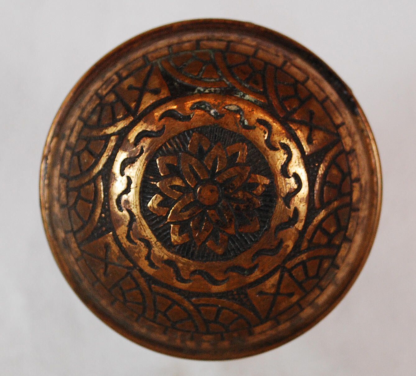 Construction: Surface Texture: Surface Color/Finish: Relieved Ornament: Fourfold symmetry Design Name: Windsor type School: Eastlake Remarks: Not really related to other Windsor designs. VDA Classification: Group & No: H 254 -254A Comment: Combination of the two designs Catalog : Company Name: Reading Type Date: c. 1890 Material: Brass Manufacturing Method: Stamped